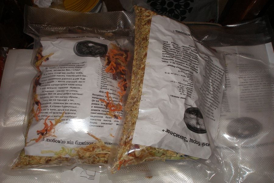 "Вага одного пакету - 630 грам разом з томатною пастою. З нього виходить 10 літрів борщу. Попередньо треба лише картоплю зварити. Зручно мати сухі борщі не тільки нашим воякам, але й волонтерам. Тепер вони можуть везти вдесятеро більше продуктів. Сухі борщі і місця менше займають, і важать набагато менше. Першими їх додумались робити наші колеги з Дніпропетровська, але ми розробили власний рецепт. Замовником у нас є волонтер Лариса Полулях, яка займається постачанням в зону АТО", - розповідає волонтер Олена Павлова.
