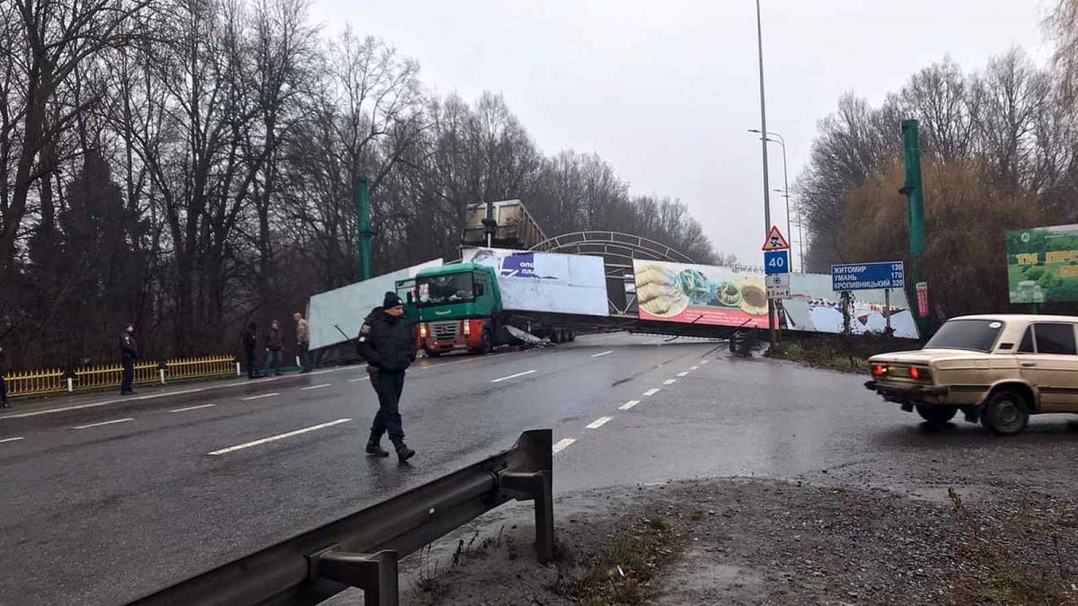 Водій вантажівки випадково підняв причіп та збив рекламний щит на об'їздному шосе у Вінниці. Наразі на дорозі утворився затор, повідомляє Vlasno.info.