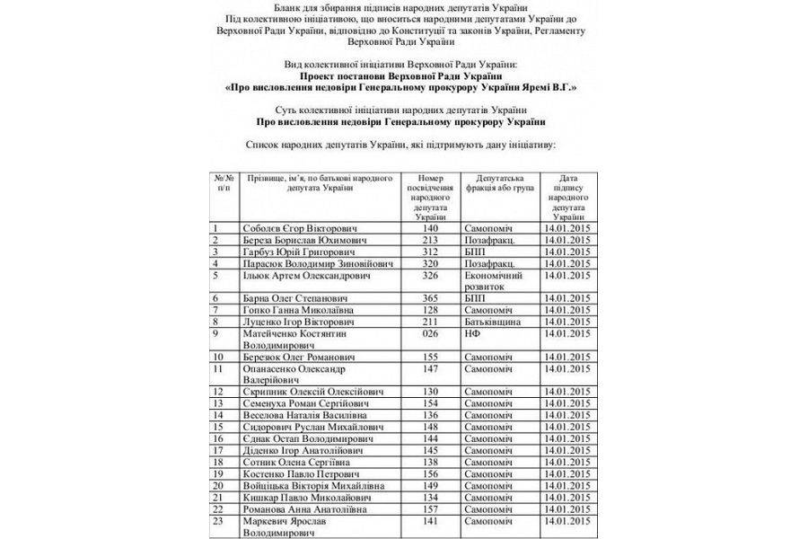 Група депутатів Верховної Ради підписала колективну ініціативу щодо висловлення недовіри Генеральному прокурору України Віталію Яремі. Для внесення проекту цієї постанови на розгляд у парламенті необхідно зібрати 150 підписів. Поки що їх 76, серед яких є підпис вінницького нардепа від «Фронту змін» Андрія Тетерука.