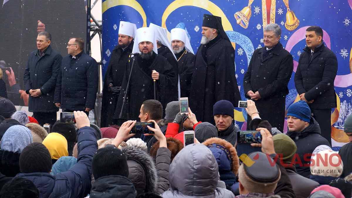 — Христос народився! Славімо його! Переговори на Фонарі тривали годинами, але звернення ієрархів всіх церков, Президента, Уряду, Верховної Ради та всіх обласних рад та молитви звичайних українців змогли переконати патріарха Варфоломія в тому, що власна українська церква – це воля українського народу. Бо наш народ не хоче ходити в чужу церкву, де моляться за Кирила. А той благословляє російську армію на вбивство українців, молиться за російську владу, сидить на засіданні міністерства оборони Росії і чомусь вважає, що має на нашу територію канонічне право. Ми народ, який має тисячолітню історію християнства на нашій землі. 1030 років тому Володимир хрестив Україну-Русь. Сьогодні ми тут, на українському майдані з молодим Шевченком. Я думаю, Тарас дивиться на нас згори та радіє нашій незалежності. Кожен день та чи інша громада і парафія приєднується до нашої церкви. Ніхто вже не здатен зупинити українів, які розбудовують свою державу і йдуть геть від Росії та Радянського Союзу, знімають ярмо російської церкви та Російської імперії. Церква повинна бути захищена від від держави, а особливо ворожої. І ми зараз захищаємо нашу церкву. Ми, українці, не будемо питати, в яку церкву ходити, в якому напрямку рухатись, або питати дозволу, коли йдемо до ЄС, НАТО. Ніхто не має права закривати перед українцями двері храма Божого, визначати, хто канонічний, а хто ні, бо в нас є Томос. Нехай росіяни покажуть свій Томос. Де їх Томос, Сталіним підписаний? Українець не повинен питати, якого патріархату церква, і ця церква має бути єдиною.